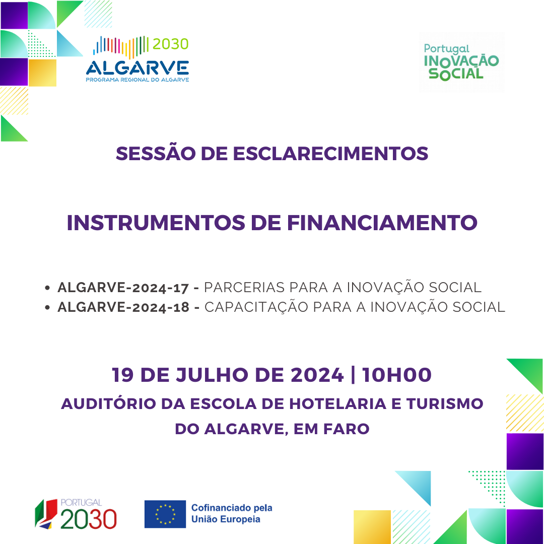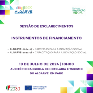 Na sequência da publicação pelo Programa Regional ALGARVE 2030 do aviso de concurso ALGARVE-2024-17 para Parcerias para a Inovação Social e do aviso de concurso ALGARVE-2024-18 para Capacitação para a Inovação Social, a Estrutura de Missão Portugal Inovação Social (EMPIS) e a Autoridade de Gestão do Programa Regional convidam para uma sessão de apresentação e de esclarecimento sobre os instrumentos de financiamento a concurso referidos.