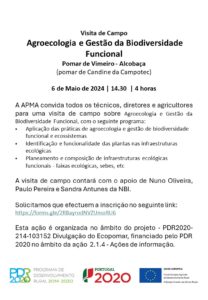 A APMA (Associação dos Produtores de Maçã de Alcobaça) organiza a visita de campo “Agroecologia e Gestão da Biodiversidade Funcional” no próximo dia 6 de maio, a partir das 14h30, no Pomar de Vimieiro, em Alcobaça.