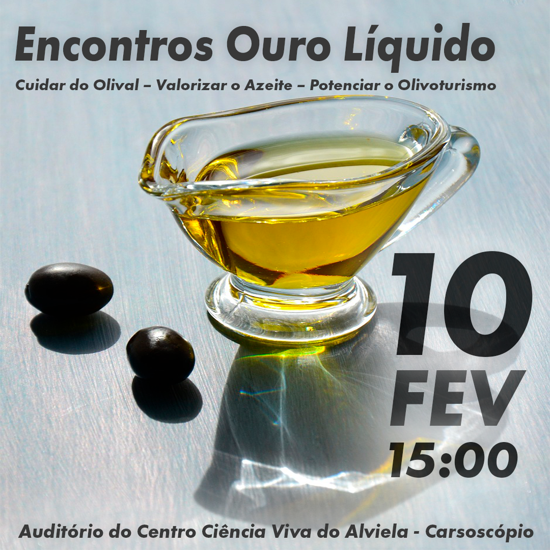 No sábado, 10 de fevereiro de 2024, às 15h, o Auditório do Centro Ciência Viva do Alviela – Carsoscópio será palco dos “Encontros Ouro Líquido”. O evento tem como base o projeto “Ouro Líquido” cujo mote é cuidar do olival, valorizar o azeite e potenciar o olivoturismo.